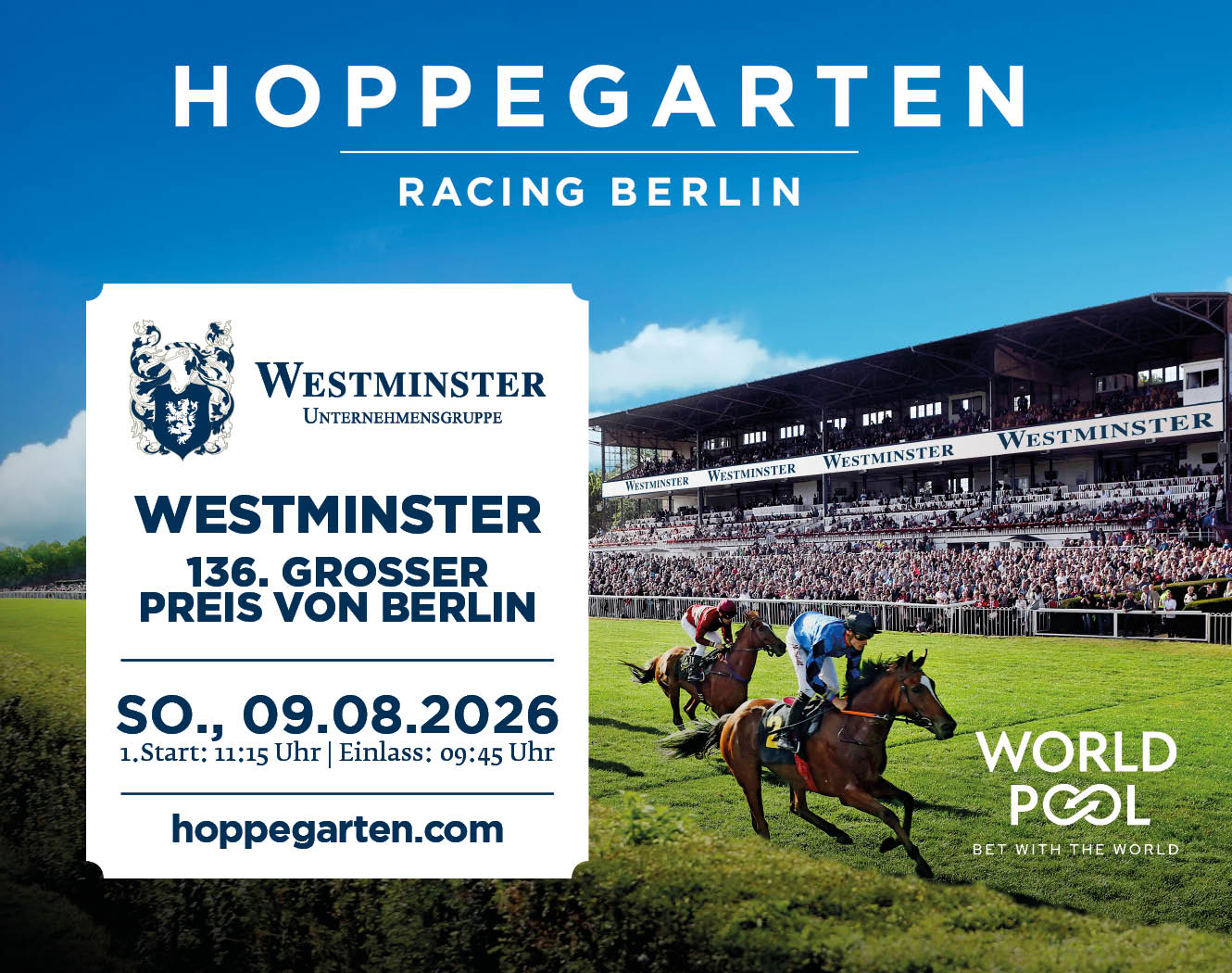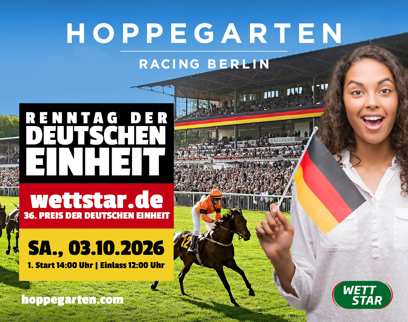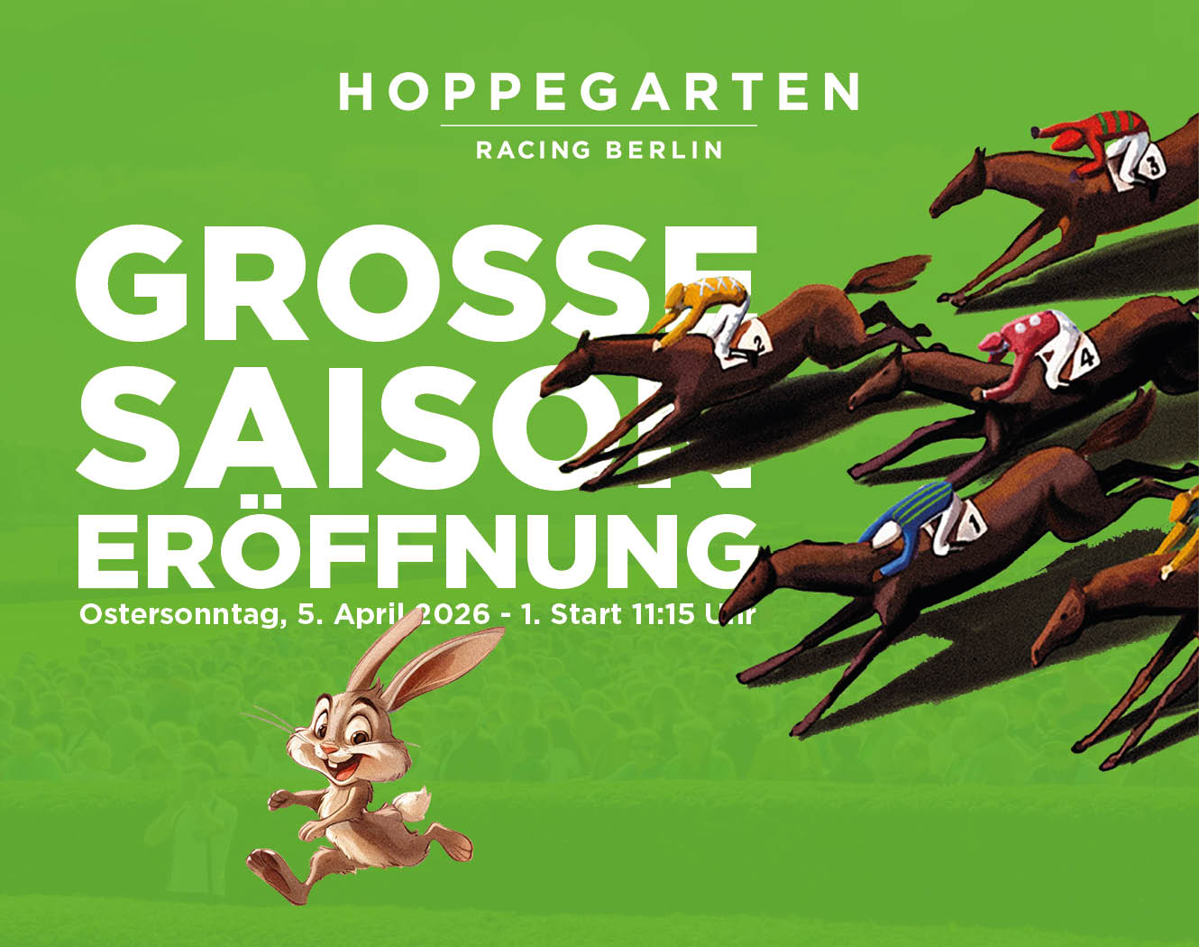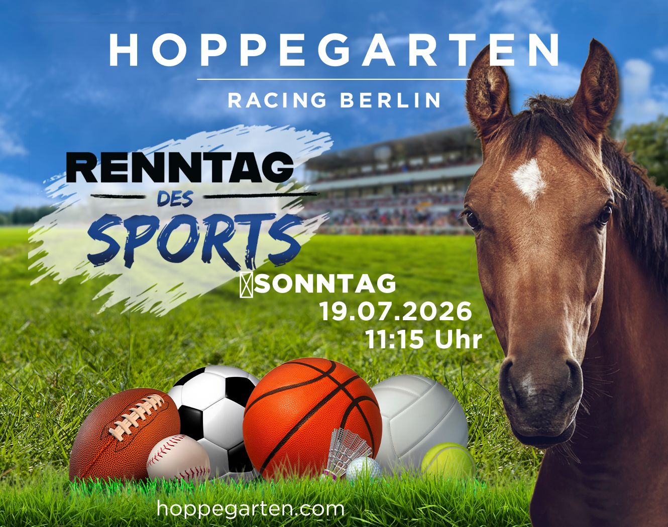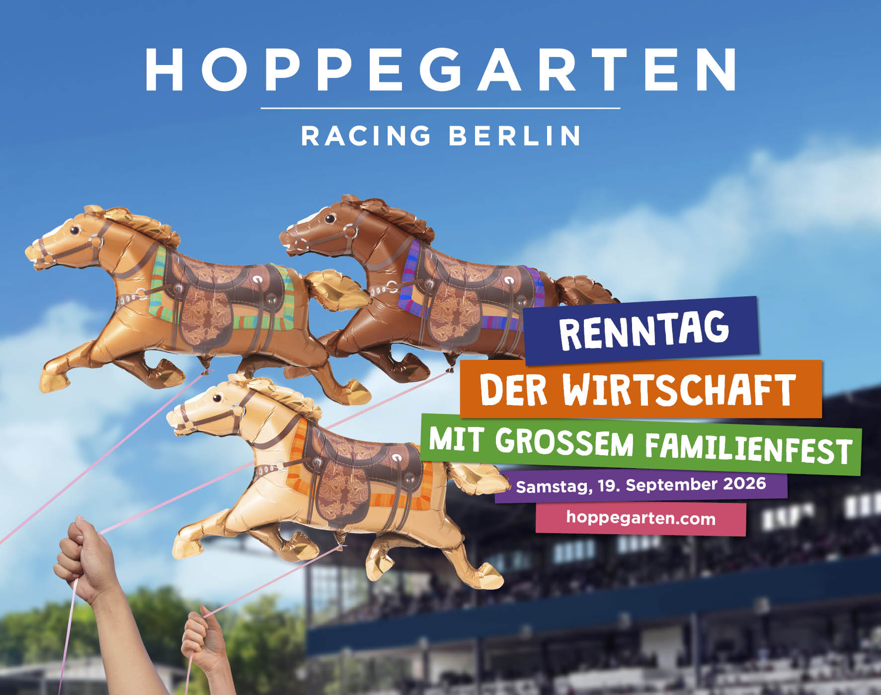 Rennbahn Hoppegarten – das heißt: Schnelle Vollblüter, Spannung pur, Spaß für die ganze Familie! Tolle Event-Location, kostenloses Kinderprogramm, Picknickwiese, Burger und Gourmetmenue, Biergarten und Champagner-Lounge, wunderschönes Denkmal im Grünen, Ausflugsziel für die ganze Familie, 30 min mit der S5 vom Alexanderplatz – hier kommen alle auf ihre Kosten.
