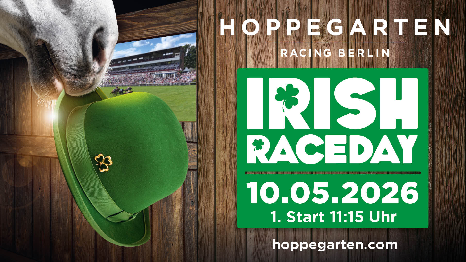 Am Sonntag, den 10.05.2026, findet unter der Schirmherrschaft der Irischen Botschafterin Maeve Collins der Irish Raceday auf der Rennbahn Hoppegarten statt. Passend zum Motto wartet auf ganz in grün gekleidete Besucher (Oberteil+Hose oder Kleid) ein Freigetränk ihrer Wahl. Die ersten 500 Besucher erhalten außerdem einen grünen Zylinder.